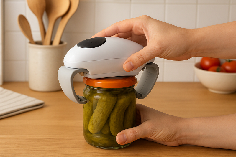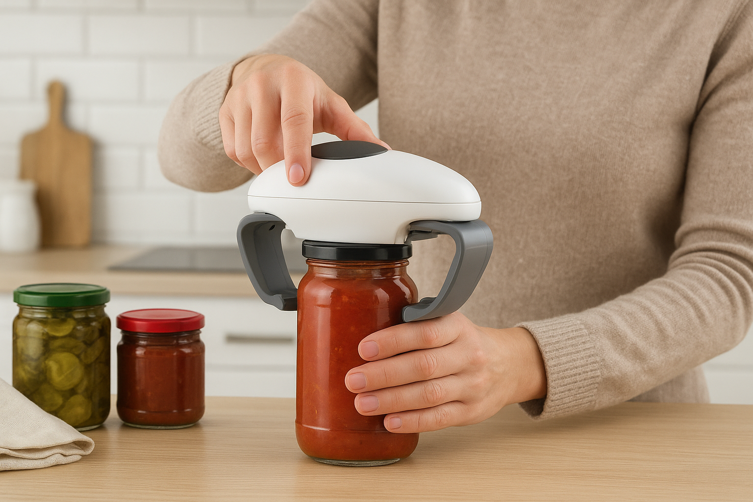 👉 Spokojnie – urządzenie automatycznie dopasowuje się do rozmiaru zakrętki, dzięki czemu radzi sobie zarówno z małymi, jak i dużymi słoikami.